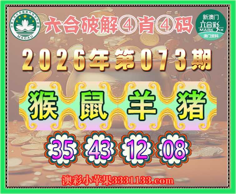 073期:『六合破解』 ④肖④码【猴鼠羊猪】【35.43.12.08】开:鸡34